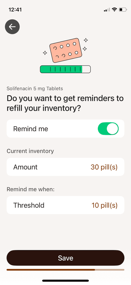 If you cannot find your medication in the app’s list, you can create a custom entry. When you do this, you can name it, select the unit (pills, patches, drops) and how often you take it.